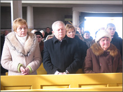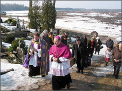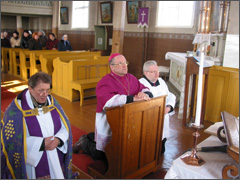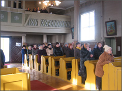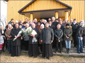 Visos parapijos vardu vyskupui Jonui Ivanauskui ir jį lydintiems kunigams padėkojo Viktorija ir Jonas Švedai už mūsų kuklios, žemdirbiškos parapijos aplankymą. Jie įteikė vyskupui J. Ivanauskui bundančios gamtos simbolį – gėlės žiedą ir mūsų darbo vaisių – duonos kepalą. O kaip vilties ženklą, kad po giliausios žiemos visada ateina pavasaris – mūsų apsnigtos bažnytėlės nuotrauką.