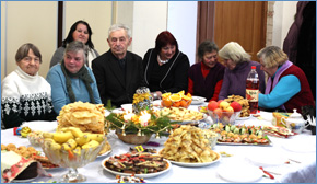 Po Šv. Mišių visi rinkosi į parapijos namus, tiesa dar nebaigtus, bet taip lauktus ir jaukius. Klebono rūpesčiu ir didelėmis pastangomis jau atvėrusius duris. Nedidelėje salėje, prie adventinio vaišių stalo kaip viena šeima susėdę visi dalinosi ne tik duona, bet ir džiaugsmais, rūpesčiais, širdies šiluma.