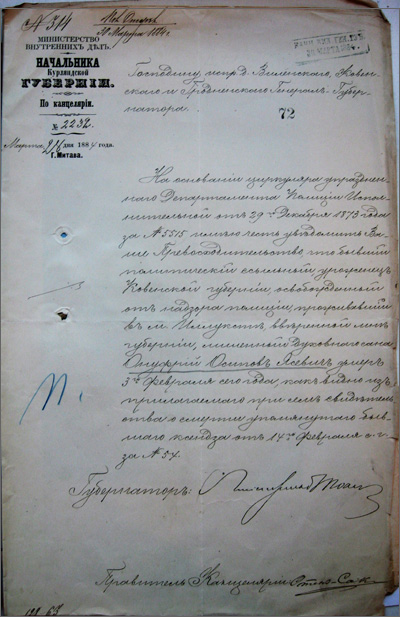 Antrasis pranešimas apie Jasevičiaus mirtį. Tuo metu gyveno Kuršo gubernijoje, nes iš tremties buvo paleistas. Tačiaubuvusiems politiniams kaliniams retai kada leisdavo grįžti į tėvynę - tekdavo apsigyventi gretimoje Latvijoje ar keltis į Lenkiją.