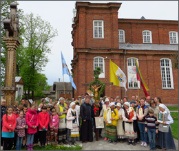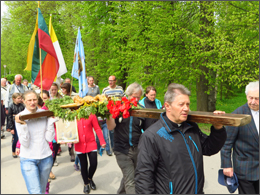 Gaudžiant varpams, bažnyčioje mus pasitiko giesme „Šventuoju prisikėlimu“, kuri mus lydi visą kelionę. Ten sveikinimo kalbą pasakęs kun. Gintautas Jankauskas, aukojo Mišias, be kurių neįsivaizduojama mūsų diena. Dėmėsį atkreipė būrys vaikų, kurie ruošėsi pirmajai komunijai. Tikimės, kad jie, susižavėję šiuo prasmingu gyvenimo būdu, ateityje patys taps piligrimais. Žodžio liturgijoje tarnavo patys piligrimai, taip į šventovę įnešdami naujos dvasios. Parapijiečiai ten turėjo galimybę prisiliesti prie keliaujančiojo Kryžiaus, pasimelsti prie jo. Tradiciškai, Kryžių išnešė pats kunigas, palydėdamas piligrimus į valgyklą. „Taip jau sutverta, kad žmogui reikia dvejopos duonos – ir dvasiai, ir kūnui“, pietų svarbą pabrėžė kun. Gintautas.