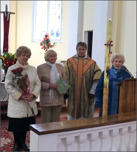 Sveikinimo kalbą jubilijatei pasakė Ariogalos parapijos Pastoracinės Tarybos narė Genė Kringelienė, šventinę rožių puokštę įteikė bažnyčios Sumos choro vardu vargonininkė Marija Vaitekūnienė. Po to visi sugiedojome „Ilgiausių metų”.