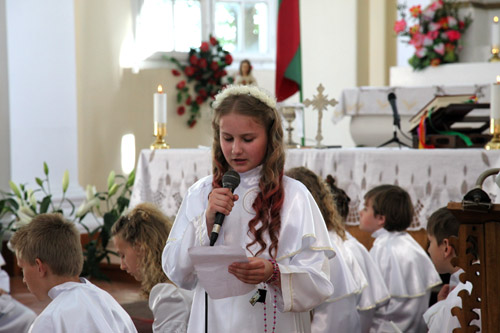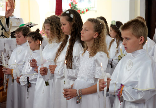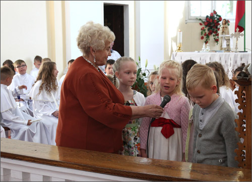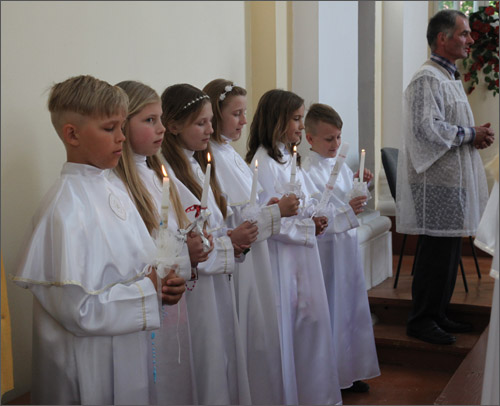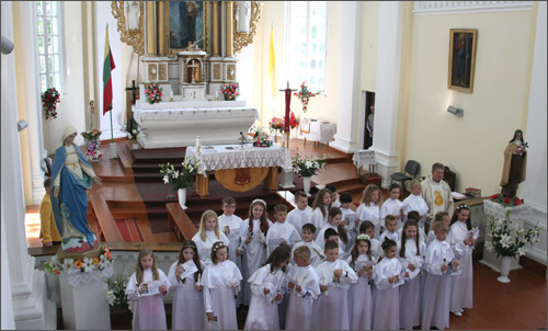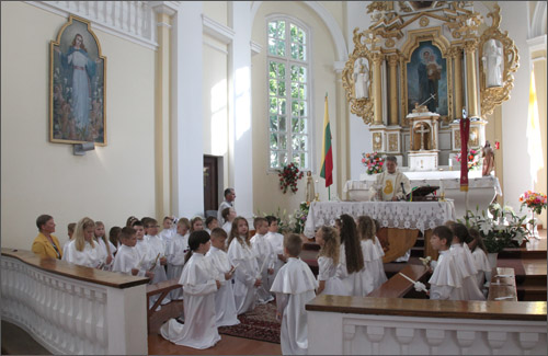 Gerb. klebonas, kun. Gintautas Jankauskas, visada labai stengiasi, kad vaikučiams jų pirmosios Komunijos šventė būtų nepamirštama ir ypatinga. Taip nutiko ir šį kartą. Sumos chorui giedant „Ave Marija” klebonas trisdešimt vaikučių, kartu su jų tėveliais, įvedė į bažnyčią, paprašė, kad jie palaimintų savo vaikučius. Tai buvo labai jautrus ir gražus gestas. Visi vaikučiai buvo susodinti prie altoriaus. Klebonas juos pasveikino pačiais gražiausiais žodžiais, palinkėjo sėkmės tėveliams, auklėjant savo vaikučius.