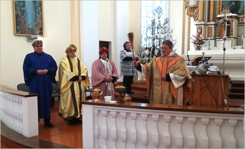 Tris Karalius sutiko ir labai gražiai pasveikino klebonas, kun. G. Jankauskas. Karaliai įteikė klebonui atneštas dovanas. Klebonas jas pašventino. Taip pat pašventino ir kreidą, kurią išsinešėme į namus, kad pažymėtume savo namų duris trimis raidėmis: K M B, tarp jų dėdami kryželį.