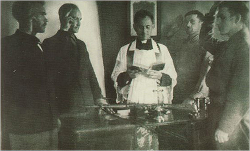 Tauro apygardos štabo pareigūnų priesaika 1945 m. liepos 19 d. Iš kairės: Komplektavimo ir ginklavimosi skyriaus viršininkas Jonas Pileckis-Brokas, štabo viršininkas Leonas Taunys-Kovas, Sanitarinės dalies viršininkas bei kapelionas Antanas Ylius-Vilkas, Propagandos skyriaus viršininkas Albinas Ratkelis-Oželis, Baudžiamojo skyriaus viršininkas Vytautas Vitalius Gavėnas-Vampyras. Marijampolės aps. ir vls. Skardupių klebonija, 1945 m. liepos 19 d. Iš Genocido aukų muziejaus fondų.