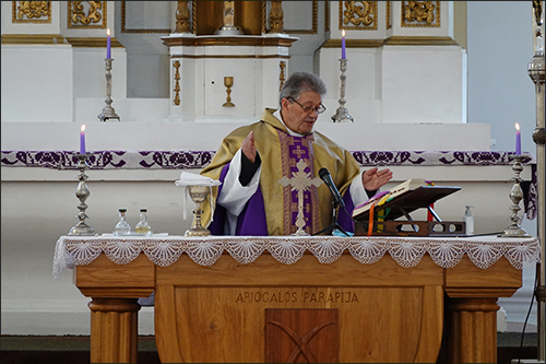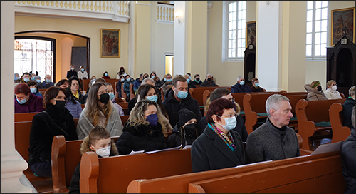 Žodžio liturgijoje klebonas kun. G. Jankauskas perskaitė popiežiaus Pranciškaus Europos katalikų socialinių dienų atidarymo proga Bratislavoje laišką Vilniaus arkivyskupui ir Europos vyskupų konferencijų tarybos pirmininkui Gintarui Grušui. Kvietė priimti popiežiaus Pranciškaus raginimą visus tikinčiuosius vienytis maldoje už taiką ir paaukoti Rusiją ir Ukrainą Nekalčiausiai Marijos Širdžiai kovo 25 d. 17 val. Romos laiku, 18 val. Lietuvos laiku.