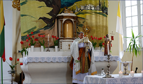 Bažnyčią papuošė iš gėlių nupintas skaičius „20 ”. Tai buvo akcentas, kad mūsų klebonas kun. Gintautas jau dvidešimt metų apaštalauja Ariogalos parapijoje. Pilnutėlė bažnyčia taip pat parodė, kad ariogaliečiai gerbia ir myli savo sielų ganytoją.
