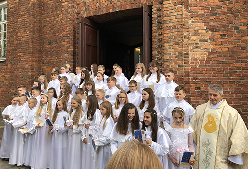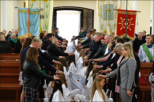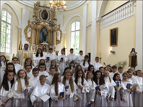 Šios šventės metu mūsų parapijoje Šventąją Komuniją pirmą kartą priėmė 40 vaikų ir paauglių. Po Šv. Mišių klebonas kun. G. Jankauskas vaikams iškilmingai įteikė pažymėjimus ir sveikinimo atvirukus, kuriuose palinkėjo „Širdyse visada nešioti gyvą tikėjimą ir viltį šviesesne ateitimi. Būti taikos ir ramybės nešėjais, pilnais Viešpaties malonių gausos”.