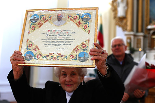 Pačiu gražiausiu sveikinimu, kurį gavo mūsų gerb. klebonas Gintautas Jankauskas jubiliejinio gimtadienio proga – Popiežiaus Pranciškaus palaiminimas. Jį įteikė Ariogalos šv. Arkangelo Mykolo parapijos pastoracinės tarybos pirmininko pavaduotoja Genutė Kringelienė.