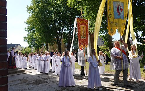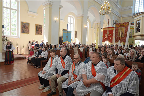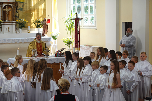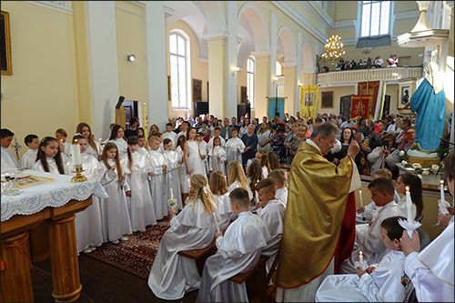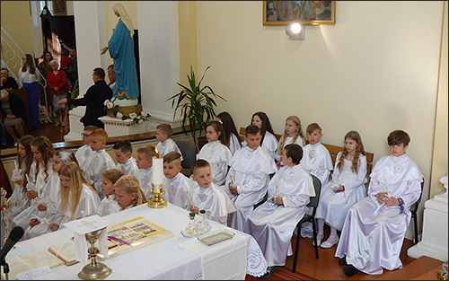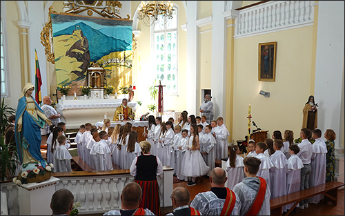 Prasidėjo šv. Mišios. Jas klebonas G. Jankauskas aukojo už Pirmąją Komuniją priimančius vaikučius, jų tėvelius ar globėjus, taip pat už visus tikinčiuosius.