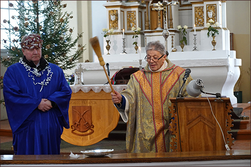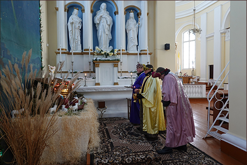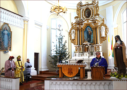 Parapijos klebonas kunigas Gintautas pasveikino atvykusius išminčius ir pakvietė į presbiteriją kartu dalyvauti šv.Mišių aukoje. Vienas iš karalių skaitė visuotinę maldą, skirtą šiai iškilmei. O pabaigoje pasveikino visus tikinčiuosius, linkėdamas, sveikatos, ramybės ir taikios padangės.