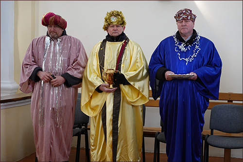 Pasirodo, jog mus aplankė Trys Karaliai iš Rytų kraštų: Kasparas, Merkelis ir Baltazaras. Chorui giedant „Sveikas, Jėzau gimusis” karaliai nuėjo prie Prakartėlės ir parpuolę ant kelių pagarbino Kūdikėlį Jėzų, taip pat atnešė dovanų:aukso, smilkalų ir miros. Taip, kaip tai darė Trys Karaliai Jėzaus laikais.