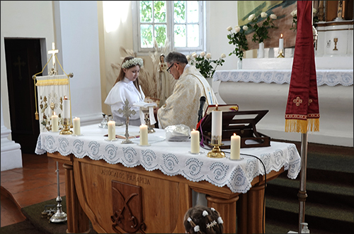 Kulikauskaitė, viena iš gausaus būrio vaikų, kurie šiandien priima pirmą kartą šv. Komuniją.